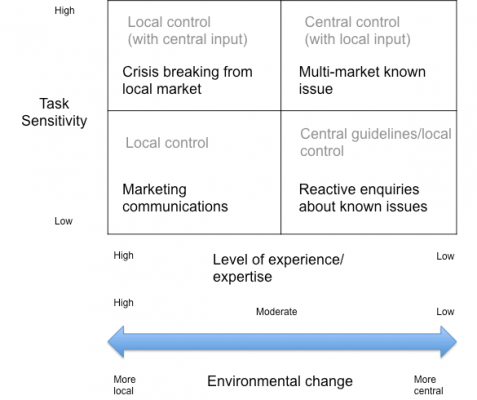 The research found that there are benefits to a flexible function design that will allow centralisation and decentralisation of ‘communication networks’ for different tasks. However, the decision about how to structure PR teams will be contingent on the operating environment for an organisation in different markets, the experience and expertise of staff in those locations and the sensitivity of different tasks needing to be performed (often defined by what is on the radar of senior management).